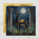 A black and gold Gazelle themed blank notecard. On the front is an illustration of a majestic gazelle with fur like molten black and gold, standing in ancient ruins bathed in ethereal moonlight. Intricate carvings adorn crumbling stone pillars, and bioluminescent flora casts a soft, otherworldly glow. The scene is rendered in a rich, textural oil painting style with thick impasto strokes.