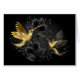 Black and gold jewellery hummingbirds on grey background decorated with plants. Jewellery birds. Golden bird. Gold bird.