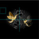 Black and gold jewellery hummingbirds on grey background decorated with plants. Jewellery birds. Golden bird. Gold bird.