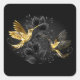 Black and gold jewellery hummingbirds on grey background decorated with plants. Jewellery birds. Golden bird. Gold bird.