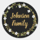 Christmas holiday stickers with our a pretty laurel wreath of gold, white, and green on a black background. You can easily customise these name stickers with your last name before ordering with fancy gold cursive text!