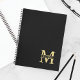 featuring personalised monogram in gold classic serif font style with box of name in the middle of monogram on black background.