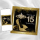 Beautiful black and gold stepping Quinceañera invitation with elegant sparkling water glass and gold high heel shoes. You can easily customise this elegant black and gold stepping into 15 birthday party invitation for your event by simply adding your details in the font style and colour, and wording of your choice. You can also delete the glass.