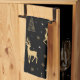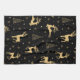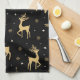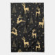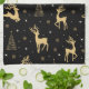 Elegant gold reindeer surrounded by stylised gold Christmas trees, gold snowflakes, and white stars on a black background.