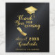 Unique black and gold graduation party wine bottle labels with the thank you message and template for the graduate's name and year. The typography is decorated with grad's cap and diploma graphic in golden yellow colours.