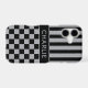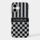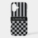 Customize this iPhone 17 case with black and gray stripes on the top half and black and gray checkered pattern on the bottom half with your name in a modern CAP font in the middle in gray on black. It's preppy, trendy and bold - definitely cool!