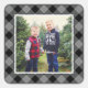 Square holiday photo sticker design features your favourite photo with a grey and black check plaid buffalo patterned frame. Tip: crop your photo to a square format before uploading it to the site. Photo credit: Two Fish Photography www.twofishphoto.com