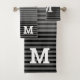 Monogrammed bath towel set done in a black to grey ombre striped pattern. Personalise the large white one letter monogram to suit your needs.