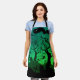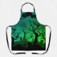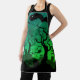 Black and neon green haunted graveyard Halloween apron. This all-over print apron displays a haunted cemetery in black and neon green with gravestones, spooky trees, a witch, an owl and bats.