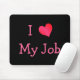 Customisable "I Love My Job" text design on a black coloured mouse pad. The design features a lovely pink and red heart design against a solid black background. Besides changing the word defining what you love, on many of the products you can change text and background colour as well.