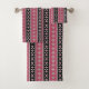 Black and pink bathroom towel set featuring stripes and diamonds.