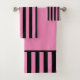 Trendy towel set featuring a black and pink vertical stripe pattern.