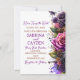 A gorgeous purple, black and gold floral steampunk wedding invitation. The front is adorned with beautiful purple roses, gold and copper gears and key, butterflies and flowers.