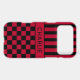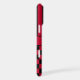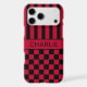 Customise this iPhone 17 pro max case with black and red stripes on the top half and black and red chequered pattern on the bottom half with your name in a modern CAP font in the middle in black on red. It's preppy, trendy and bold - definitely cool!