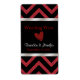 Elegant wedding mini wine labels ready for you to personalise with your own information. The black label has a glittery looking red and black chevron pattern, on the top and bottom of the label, with a silver tone border. The black middle text area, has custom red and white text, and a red heart, in the middle. Personalise the text, to suit your wedding needs. Great for your wedding reception table or gift wines.