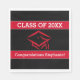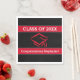 Simple yet stunning graduation design features a red mortarboard graduation cap in the centre. Above and below the graduation cap are thick red lines with white trim. Inside the top line is customisable text that says Class Of 20XX where you can add the correct graduation class year. Inside the lower line is customisable text in white font there you can add the graduates name, etc. Matching invitations and favours also available!