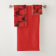 Beautiful Black and red patterned towel set, that would be perfect for a modern apartment or guest bathroom. Plain black main bath towel with other part of set in unique pattern.