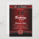 A red and black surprise 18th birthday party invitation featuring white text and a red and white ribbon and bow. Replace the details on this invitation with your own to create the perfect surprise birthday party invitation for your event.