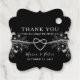 Boho, elegant, black and red wedding thank you favour tag, with silver rope heart, gilded floral lace and modern calligraphy script.