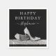 Elegant and Chic Modern Silver and Black Happy Birthday Personalised Napkins with Faux Glitter Silver High Heel Stiletto Shoes and custom name calligraphy script cursive in black and white.