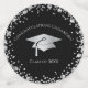 This modern design features a graduation hat and confetti in silver on a background of black with white text.