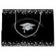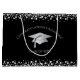 This modern design features a graduation hat and confetti in silver on a background of black with white text.