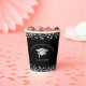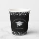 This modern design features a graduation hat and confetti in silver on a background of black with white text.