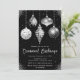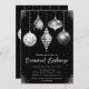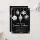 Host a festive and stylish ornament exchange with this luxurious black and silver invitation. This design features a rich black background adorned with shimmering silver accents and five intricately illustrated hanging ornaments, each showcasing floral, snowflake and geometric patterns. This elegant layout sets the tone for a warm and celebratory seasonal gathering. Perfect for holiday swaps, office events or cozy get-togethers with friends and family.