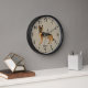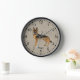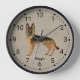 Destei's original cartoon illustration of a black and tan colour German Shepherd breed dog. The background colour is beige with a decorative texture. The texture can be removed and the background colour can be changed to any other colour, if so wished. The hours are marked with numbers. The hours and minutes are shown with a dotted clock face. There is also a personalizable text area for a name or other custom text.