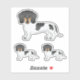 Destei's original cartoon illustration of a cute short hair black and tan piebald coat colour Dachshund breed dog. The design is placed three times on the sheet in two different sizes. There is one larger one and two smaller ones.