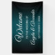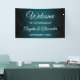 A modern elegant white calligraphy with a modern all caps style font displays a wedding welcome text message