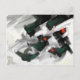 Black and white abstract composition with a few small traces of colour, red and green. Oil painting style with large brush strokes.