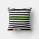 On trend for the season, this gorgeous pillow is patterned in shades of bold black and vibrant white with one bright neon green stripe in the centre. Classic narrow striped pattern offers a fresh contrast to the ultra modern colour palate. Comfy, stylish, trendy, can be used indoors or outdoors.