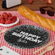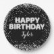 Black and white birthday party paper plates for a fun party with a modern classic look with glitter and foil balloons on personalised paper plates.