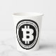 Celebrate in style with custom party supplies. These paper cups are ready to be customised with your own messages with one message at the top and one at the bottom. In the centre is a Bitcoin symbol in black against a white background. The design appears on both sides of the cup.