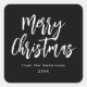 Modern holiday stickers featuring "Merry Christmas" displayed in white brush script lettering with a black background. Personalise the simple Merry Christmas stickers with your name and year in white lettering. The black and white Christmas stickers are perfect for sealing holiday envelopes, party favour bags, and gifts.