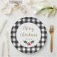 Black and White Buffalo Plaid Holly Christmas Paper Plate
