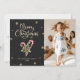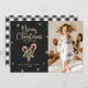 Custom photo Merry Christmas card featuring an elegant script font and Christmas candy canes, holly and red berries against a black and white buffalo plaid background on the front and snowflakes at the back. Easily personalise this plaid holiday card with your photo and text.