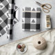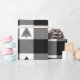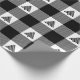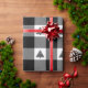 Modern black and white buffalo plaid patterned wrapping paper with Christmas trees incorporated into the geometric design.