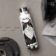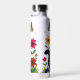A sweet personalized water bottle with a cute illustration of a black and white cat surrounded by flowers and butterflies in a paper quilling impasto style.
