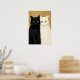 The painting features two cats, one black and one white, positioned side-by-side against a warm, golden background. Both cats have piercing yellow eyes and are looking directly at the viewer. The black cat has a serious expression, while the white cat appears more relaxed. The artist has captured the cats' fur with meticulous detail, creating a sense of realism and texture.