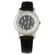 A black and white pattern of sitting silhouette cats is the background for this cute watch. A white outer ring holds black numbers at the 12, 3, 6, and 9 positions, with little cat paws at the remaining positions. *Thanks to ThingsByLary for the pattern in this design.
