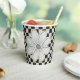 The clean, bold lines of this paper cup designed by digital artist, Leslie Sigal Javorek, is a perfect choice for modern and neutral urban sophisticated events. Featured is a large central white & grey daisy (painted in a manner to suggest diamonds) that intersects a black & white marbled chequerboard all centred and set against a solid black field.