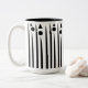 Black and White Circle Triangle Stripe Pattern Two-Tone Coffee Mug. Simple black vertical stripes with small circles and triangles on a white background.