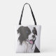 This useful tote bag unusual design features my drawing of a black and white Border Collie with blue eyes. The drawing is based on my own pet Gypsy, who was a loyal friend for many years. She blue eyes, but I have also seen Collies with brown eyes, and even one of each!