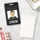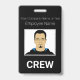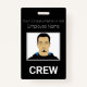 This custom photo identification badge features a sample photograph in the centre. The title "CREW" is printed below it in bold white font over a black background to signify the individual as a crew member for your event. You can include your company name or additional text above the image, as well as an employee name. The back of the badge features additional employee or company information printed over a black background, with a sample barcode placed at the bottom. You can replace the scan code with your own, or another image, such as a custom logo.