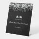 A fun black and white wedding Pedestal sign to Please Sign Our Guestbook on a black background and light grey text.