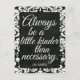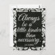 This elegant and classy postcard provides great words on inspiration. The postcard reads, “Always Be A Little Kinder than Necessary”. This is a quote by J.M. Barrie, the creator of Peter Pan. The quote is printed in a white cursive font on a black background. This postcard features a black and white border that includes a popular and stylish damask pattern. These are terrific for teachers, guidance counsellors, and principals to give to students who are in need of a pick me up. As a former teacher, I know this is the type of item that teachers adore giving to students, and students love them as well. These are also great for general correspondence. I have also seen these motivational cards framed and displayed on office walls and desks. Give as a gift, or keep for yourself. How you want to use it is entirely up to you! Zazzle postcards are great quality, and extremely affordable. The postcard measures 5.6" x 4.25" inches on high quality cardstock paper. Please send me a message if you have any questions or concerns.