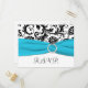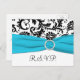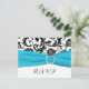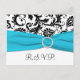 This black and white damask RSVP card has an aqua blue PRINTED ribbon and PRINTED diamond jewel brooch that would be perfect for an aqua and black themed wedding. Some of the papers will alter the colour of the design, so use caution if you choose the felt paper, as it may yellow the look more than you want. I would NOT use the gold or silver metallic papers, as they will darken the design without adding any extra sparkle to it than what you would get with the metallic ice or champagne papers. ALSO, if you re-size the card, or if you change fonts, or the size of the font, some of the design and/or text may get cut-off. Everything will print as you see it on your monitor. I will not see your invitation, and Zazzle will NOT correct anything (typos, mis-alignment etc.). The text and paper is all customisable. ****PLEASE NOTE that the small RSVP card (3.5”x5.0”) is the ONLY card that will fit in the envelope for the 5.25” square invitation, if applicable. If you need help with this invitation, please email me BEFORE you place your order. If you require any other matching items, please email your request to niteowlstudio@gmail.com.
