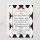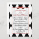 Elegant black and white Harlequin design wedding invitation, with red bow and accents. Customise all the text fields to your needs. Change text style and colour too if you choose.